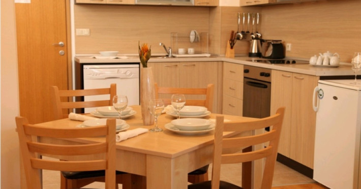 - bucatarie complet utilata (plita electrica, cuptor, frigider, tacamuri, oale, tigai, gatitul este permis)