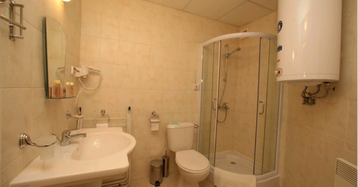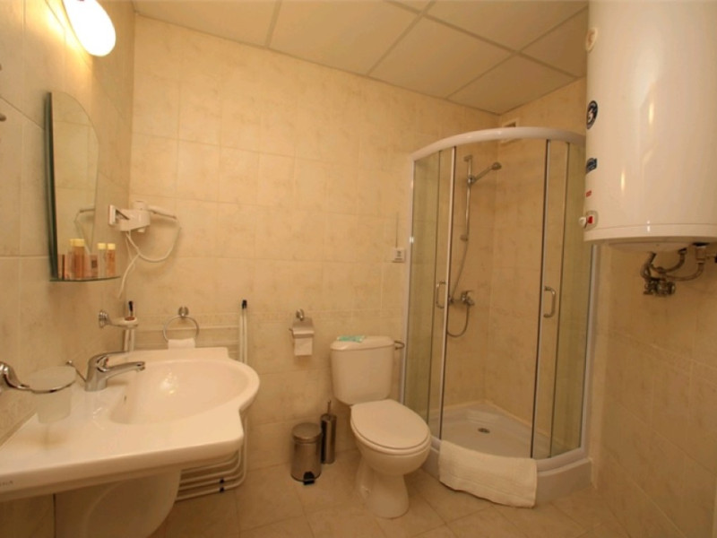 - baie cu dus / cabina de dus / cada de baie, uscator de par, prosoape si produse cosmetice de baie