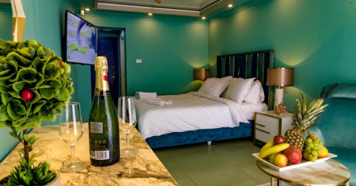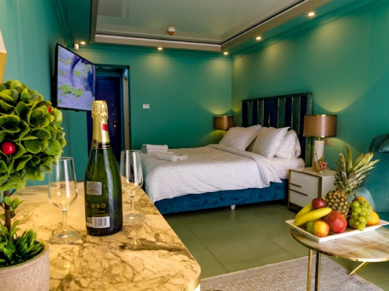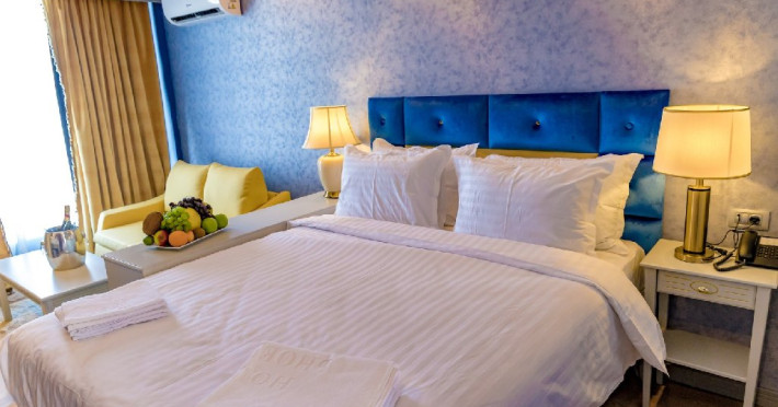 Apartament cu Living si dormitor - cuprinde doua spatii deschise cu o suprafata de 35-44 mp, o zona de living si o zona pentru dormit cu pat matrimonial, canapea extensibila sau fixa, baie cu dus, balcon individual, mobilier balcon, vedere spre mare/piscina si sunt situate la etajele 1,2,4,5-7. Capacitate minima: 2 adulti. Capacitate maxima: 3 adulti si un infant.