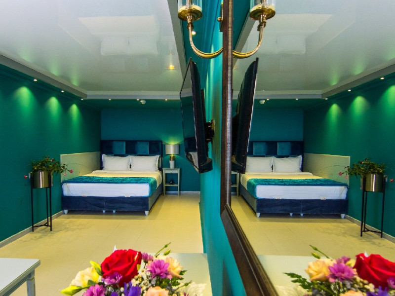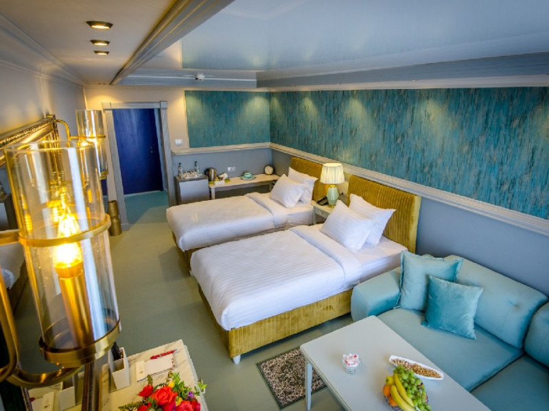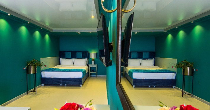 Suite cu doua dormitoare si doua paturi - cuprinde doua spatii deschise cu o suprafata de 35-44 mp, doua zone pentru dormit cu pat matrimonial (doua paturi), canapea extensibila sau fixa, baie cu dus, balcon individual, mobilier balcon, vedere spre mare/piscina si sunt situate la etajele 2-4. Capacitate minima: 2 adulti + 2 copii (7 - 11.99 ani) sau 3 adulti. Capacitate maxima: 4 adulti si 1 infant.