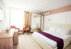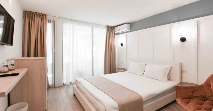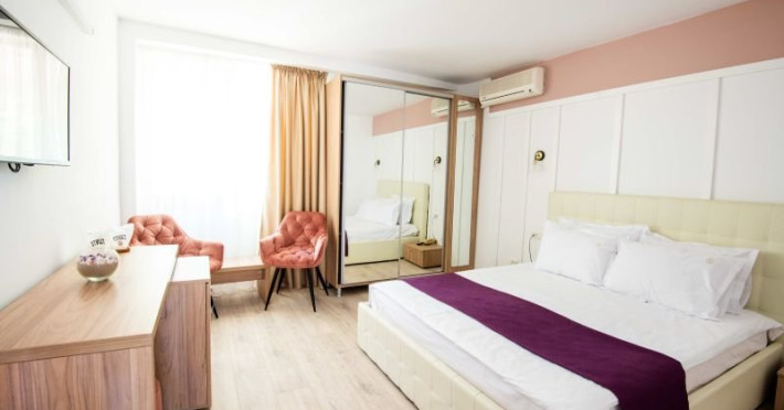 Dotari camere Camere duble 4* fara balcon, cu o suprafata de 16 - 18 mp, se afla in cladirea principala a resortului, fiind mdoernizate in anul 2021, nu au balcon, detin un pat matrimonial (160x200 cm), pot fi cu balcon sau fara balcon, mobilier nou, AC, minibar, internet,TV, seif, telefon, uscator de par, baie cu cabina de dus, cosmetice hoteliere. Acest tip de camera poate acomoda 2 adulti, 2 adulti si 2 copii ( 0 - 11.99 ani). Permite instalarea unui pat suplimentar pliant potrivit pentru o persoana (77x190 cm). Camere duble 4* cu balcon, cu o suprafata de 16 - 18 mp, se afla in cladirea principala a resortului, fiind modernizate in 2021, au balcon, detin un pat matrimonial (160x200 cm), pot fi cu balcon sau fara balcon, mobilier nou, AC, minibar, TV, seif, telefon, uscator de par, baie cu cabina de dus, cosmetice hoteliere. Acest tip de camera poate acomoda 2 adulti sau 2 adulti si 2 copii ( 0 - 11.99 ani). Permit instalarea unui pat suplimentar pliant potrivit pentru o persoana (77x190 cm). Camere family 4* fara balcon, cu o suprafata de aproximativ 25 mp, modernizate in 2021, aflate in corpul principal al hotelului, nu au balcon, detin un pat matrimonial (160x200 cm) si o canapea extensibila, TV, AC, minibar, baie cu cabina de dus, articole pentru toaleta, seif, uscator de par, internet. Acest tip de camera poate acomoda 3 adulti sau 2 adulti si 2 copii ( 0 - 17.99). Camere family 4* cu balcon in hotel/vila, cu o suprafata de aproximativ 25 mp, modernizate in 2021, se poate afla atat in corpul principal al hotelului, cat si in vile, au balcon, detin un pat matrimonial (160x200 cm) si o canapea extensibila, TV, AC, minibar, baie cu cabina de dus, articole pentru toaleta, seif, uscator de par, internet. Acest tip de camera poate acomoda 3 adulti sau 2 adulti si 2 copii ( 0 - 17.99). Camere duble economy cu balcon in vila, cu o suprafata de 15 mp, sunt situate in vilele resortului, intr-o zona verde linistita si sunt dotate cu balcon, pat matrimonial (160x200 cm), AC, TV, minibar, seif, telefon, uscator de par, baie cu cabina de dus, cosmetice hoteliere. Incepand cu 2022, acest tip de camere permit si adaugarea unui pat suplimentar pliant de o persoana (77x190 cm). Acest tip de camera poate acomoda 2 adulti. Apartamente 4* in vila sunt situate in vilele resortului, intr-o zona verde linistita, detin un dormitor cu pat matrimonial (160x200 cm) si living cu canapea extensibila, despartite de usa, AC in living, TV in fiecare camera, minibar, seif, telefon, uscator de par, baie cu cabina de dus, cosmetice hoteliere si balcon. Acest tip de apartament poate acomoda 3 adulti, 3 adulti si 1 copil ( 0 - 17.99) sau 2 adulti si 2 copii ( 0 - 17.99). Apartamente 4* cu 2 dormitoare in vila situate in vilele resortului, intr-o zona verde linistita, detin 2 dormitoare fiecare cu pat matrimonial (160x200 cm), 2 bai (doar una avand si dus) acestea sunt despartite de un hol, AC, TV in fiecare camera, minibar, seif, telefon, uscator de par, cosmetice hoteliere, fiecare dormitor are balcon propriu. Acest tip de apartament poate acomoda 3 adulti, 3 adulti si 1 copil ( 0 - 17.99) sau 2 adulti si 2 copii ( 0 - 17.99).