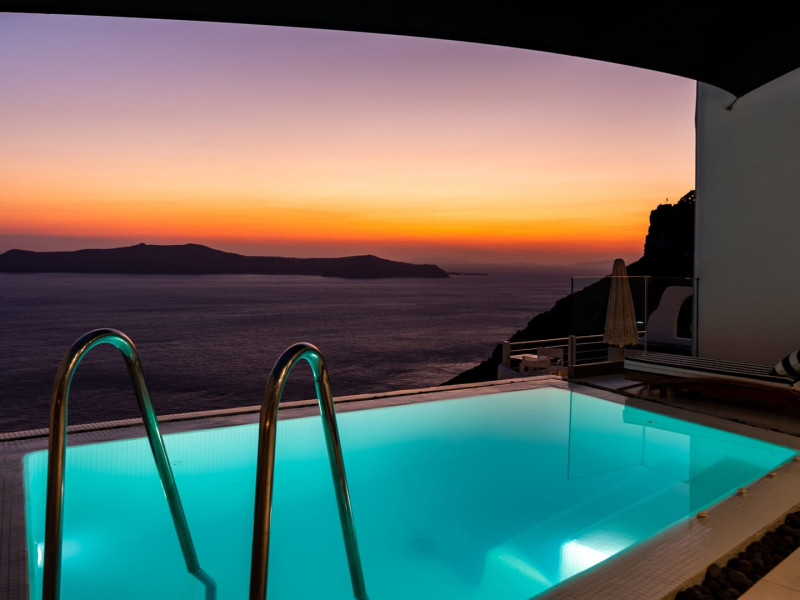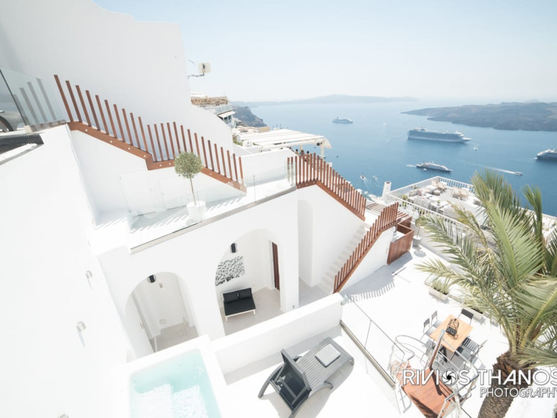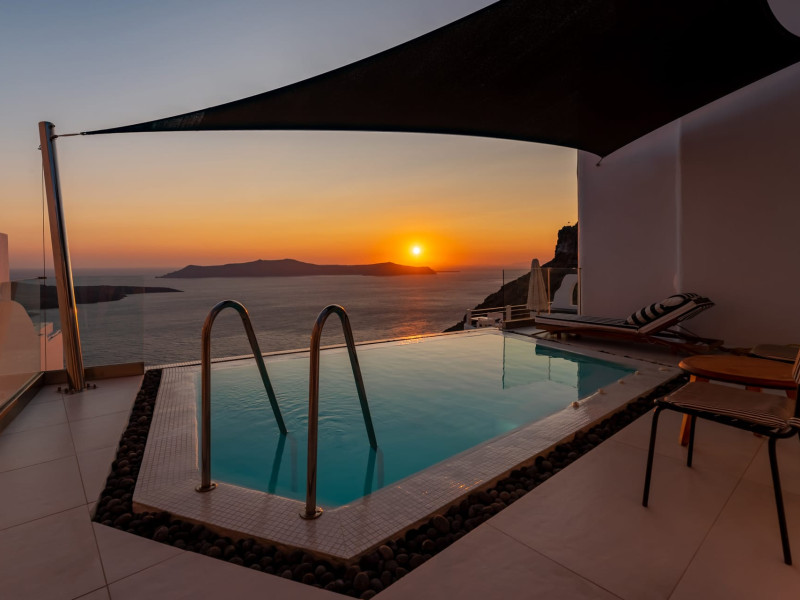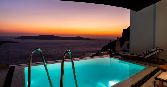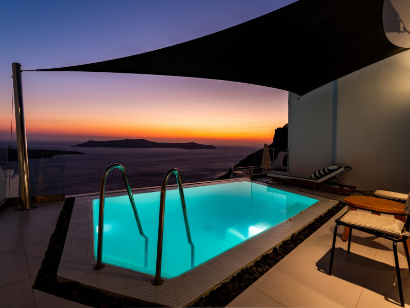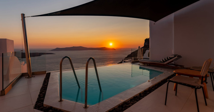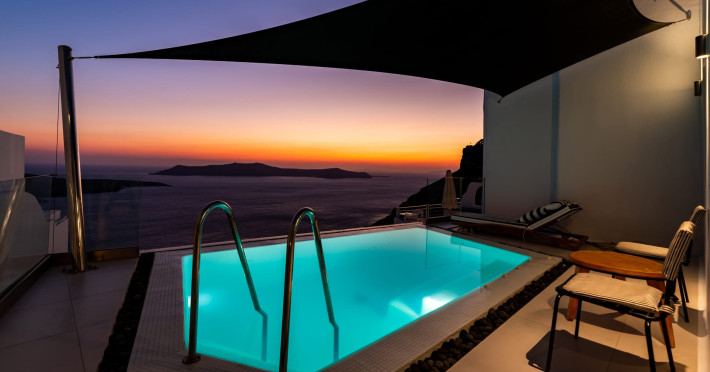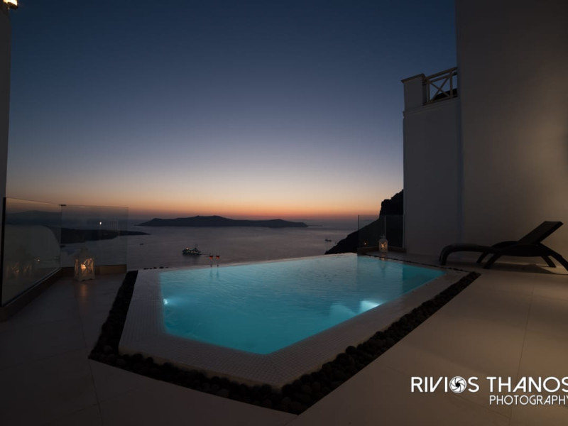 Inspired by the black volcanic nature and infused with traditional Cycladic architecture, the Day Dream Luxury Suites are the perfect combination of minimal design, true style and pure luxury.Pamper yourself in one of its infinity pools or Jacuzzis and gaze at the horizon where the sky meets the sea and together they compliment the views of the rough cliffs and the volcano that stands imposingly in the center. Take pleasure in a majestic sunset while having a unique and unforgettable experience.