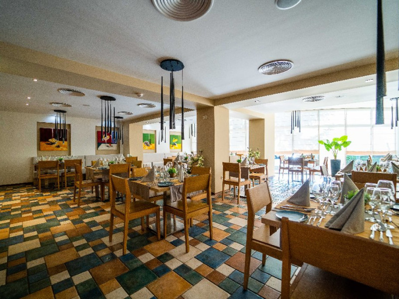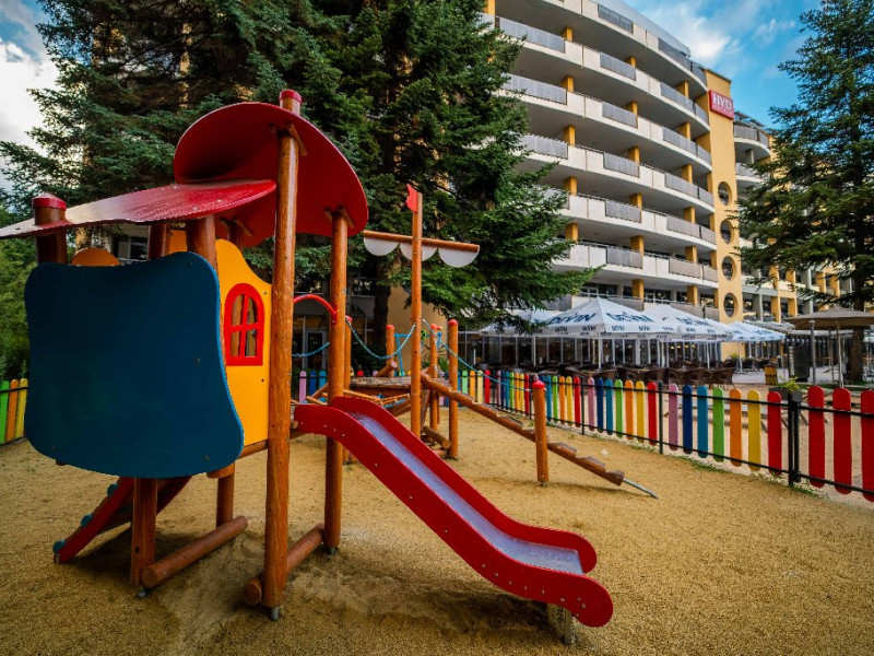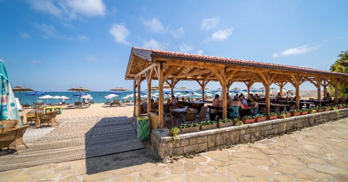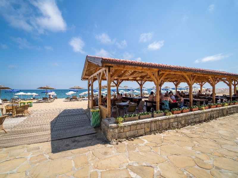 Mancare si bauturi: - Mic dejun: 07:30 - 10:00. in restaurantul principal la bufet - diverse fructe si legume proaspete, branzeturi, fulgi de porumb, croissante, clatite, oua, bauturi reci si calde. - Mic dejun tarziu: 10:00 - 11:00. in restaurantul principal la bufet - diverse fructe si legume proaspete, branzeturi, fulgi de porumb, croissante, clatite, oua, bauturi reci si calde. - Pranz: 12:00 - 14:00. in restaurantul principal la bufet - varietate de salate proaspat facute si supe aperitive calde si reci, mancaruri vegetariene si din carne, paste, deserturi de casa. Cu apa minerala inclusa, bauturi racoritoare, bere la halba si vin, cafea si ceai. Gustare de dupa-amiaza: - Snack bar BAR-B-Q: 11:00 - 17:00 h. - gratar, salate, hamburger, hot-dog, fursecuri si dulciuri, inghetata, cafea, bauturi racoritoare. - Snack bar pe plaja: 11:00 - 15:30. - gratar, salate, hamburger, hot-dog, fursecuri si dulciuri, inghetata. - Cina: 18:00 - 21:00. in restaurantul principal la bufet - varietate de preparate si specialitati din bucataria bulgara si internationala, pizza, sculptura. Cu apa minerala inclusa, bauturi racoritoare, bere la halba si vin, cafea si ceai.