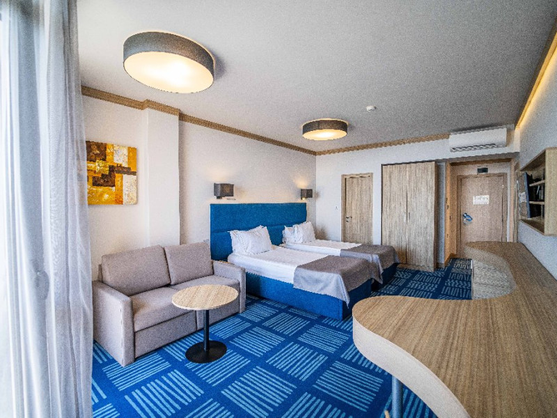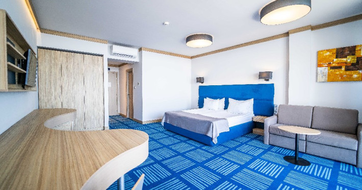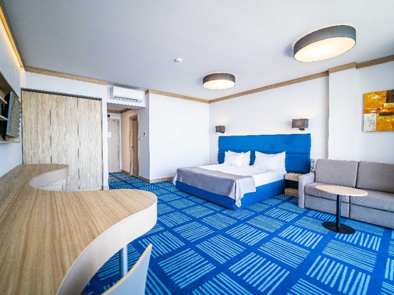 Cina a-la-carte la restaurantul italian - valabila numai pentru oaspetii cu sejur de minim 7 nopti. Valabil o data pe sejur. Este necesara rezervare prealabila. Cina a la carte la restaurantul Grill - valabila numai pentru oaspetii cu sejur de minim 7 nopti. Valabil o data pe sejur. Este necesara rezervare prealabila. Lobby Bar: 08:00 - 24:00. - alcool local si selectat de import, bauturi racoritoare, vin imbuteliat, cocktailuri, bauturi calde. Pool Bar : 10:00 - 23:00. - bauturi alcoolice locale si selectate din import, bauturi racoritoare. Snack bar pe plaja: 10:00 - 17:00. /din iunie pana la mijlocul lunii septembrie/ - bauturi fara alcool si bere Mini bar - apa minerala, suc, vin rosu si alb, bere, chipsuri, bomboane jeleu - reumplut zilnic/gratuit/ Sport si divertisment: 2 sezlonguri si 1 umbrela gratuite pe plaja (in functie de disponibilitate, din iunie pana la mijlocul lunii septembrie) Serviciu de transfer gratuit la plaja / din iunie pana la mijlocul lunii septembrie / Utilizarea gratuita a piscinei in aer liber Utilizare gratuita sezlonguri si umbrele la piscina (in functie de disponibilitate) Prosoape pentru piscina si plaja (La inceputul si sfarsitul sezonului, aceste servicii pot depinde de conditiile meteo) Internet Wi-Fi gratuit Fitness gratuit Tenis de masa gratuit Biliard gratuit Volei si minifotbal gratuit, polo pe apa, gimnastica acvatica, aerobic (conform programului de animatie)