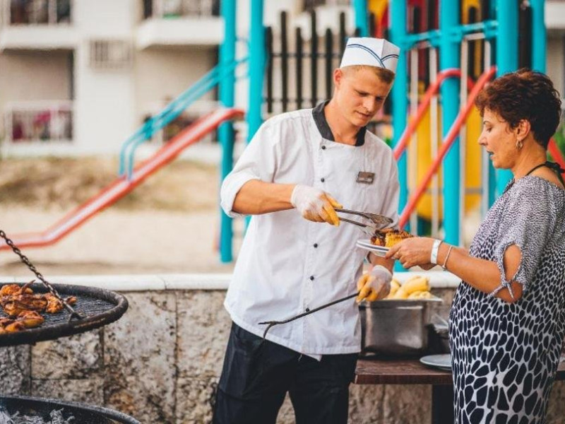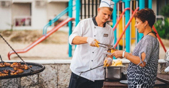 Restaurant principal Mura-Slavuna - Oaspetii se pot bucura de un meniu variat de 7 zile - meniu vegan la cerere si mancaruri vegetariene, mancaruri sanatoase, produse de productie proprie si SHO W cooking. Mic dejun: 07:30 - 10:00 (restaurant Mura) Pranz: 12:00 - 14:30 (restaurant Mura) Gustare: 15:00 - 17:00 (gustari, dulciuri, fructe, inghetata) in Snack bar. Cina: 18:00 - 21:00 (restaurant Mura) * Tineti cont de faptul ca unele dintre hoteluri ar putea schimba usor orele in functie de nationalitatile specifice cazate acolo, dar cu cel mult 30 de minute +/- . ** Cine cu gratar: 6 zile pe saptamana *** Cine tematice: de 2 ori pe saptamana **** Inghetata este disponibila in timpul meselor in restaurantul principal si la snack bar. Bauturi All Inclusive: cafea si ceai, bauturi racoritoare post mix, o selectie de bauturi produse in Albena, cum ar fi sucuri, vin si rakia, o selectie de vinuri la robinet, o selectie de bauturi spirtoase locale, bere la halba. * Toate bauturile imbuteliate si o selectie de bauturi spirtoase importate si/sau premium sunt disponibile la un cost suplimentar. Baruri all inclusive: Lobby bar: 10:00 - 23:00 h Bar la piscina: 10:00 - 23:00