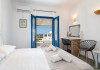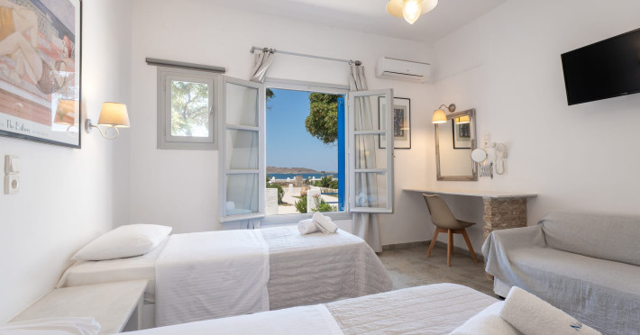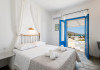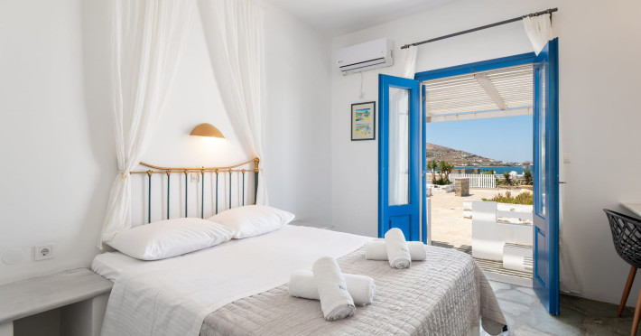 Comfortable Rooms with a View: Our hospitable and clean rooms boast incredible views of the bay of Naoussa. Each room is air-conditioned and features a private bathroom with WC/shower, a coffee/tea maker, and a refrigerator. Your comfort and relaxation are our top priorities.