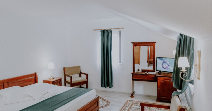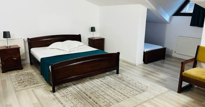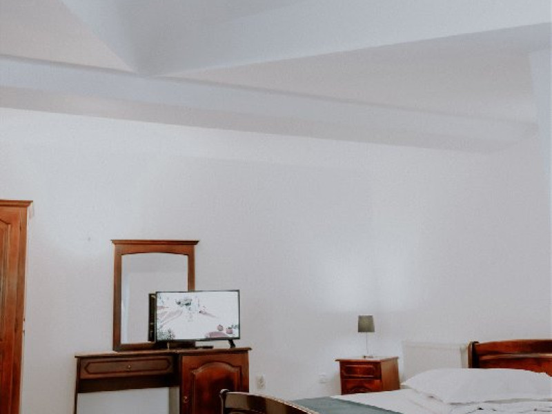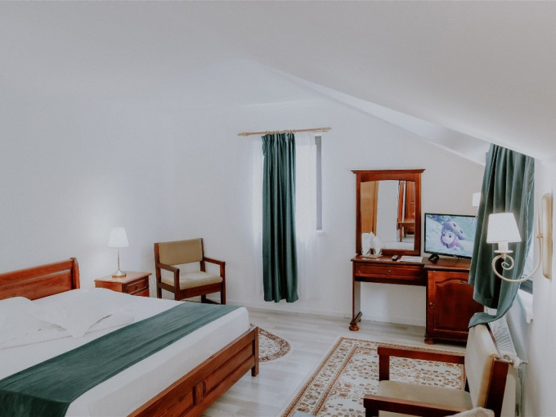 DOTARI CAMERE: Camera dubla cu pat matrimonial, dotata cu mobilier din lemn masiv, baie proprie cu dus, dressing, uscator par, TV, internet, balcon cu vedere spre padure sau munte. Camera tripla, cu pat matrimonial dublu si un pat de o persoana, dotata cu mobilier din lemn masiv, baie proprie cu dus, dressing, uscator par, TV, internet, balcon cu vedere spre padure sau munte.