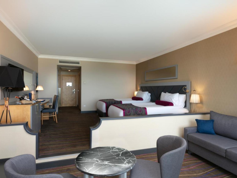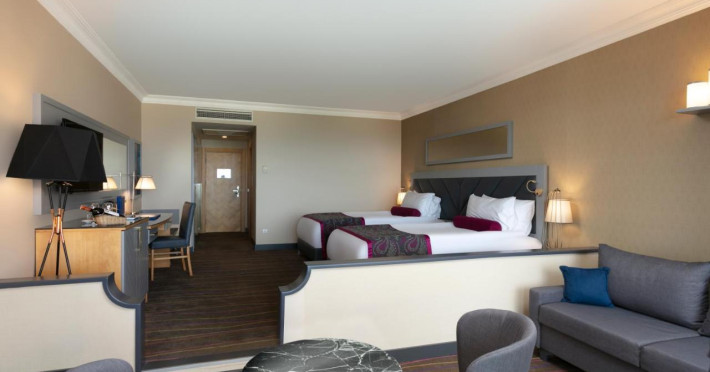 cada sau cabina de dus; uscator de par; halat de baie; aer conditionat centralizat; televizor, telefon, mini-bar (bauturi racoritoare si bere zilnic, gratuit), access la internet (cablu, contra cost), seif (în camera, gratuit) si balcon sau terasa.