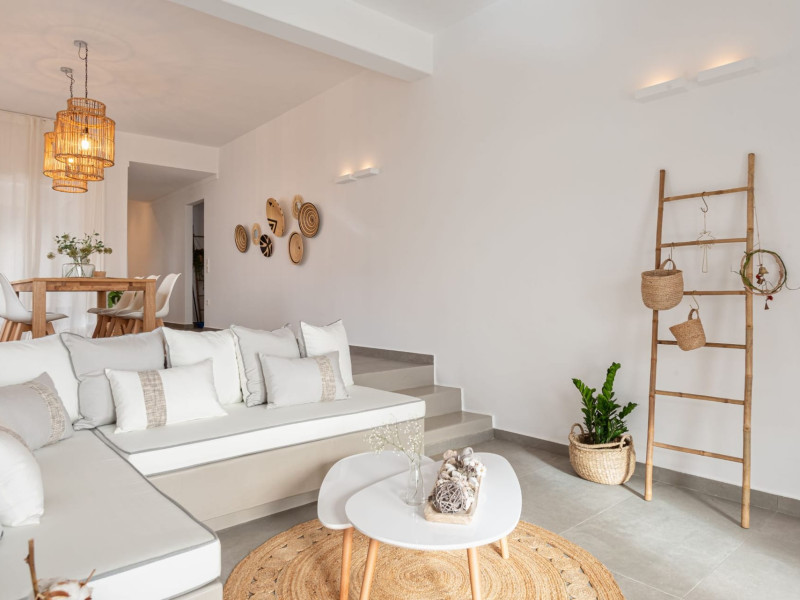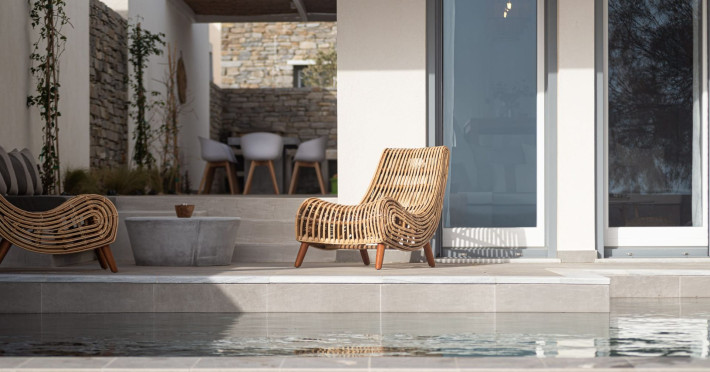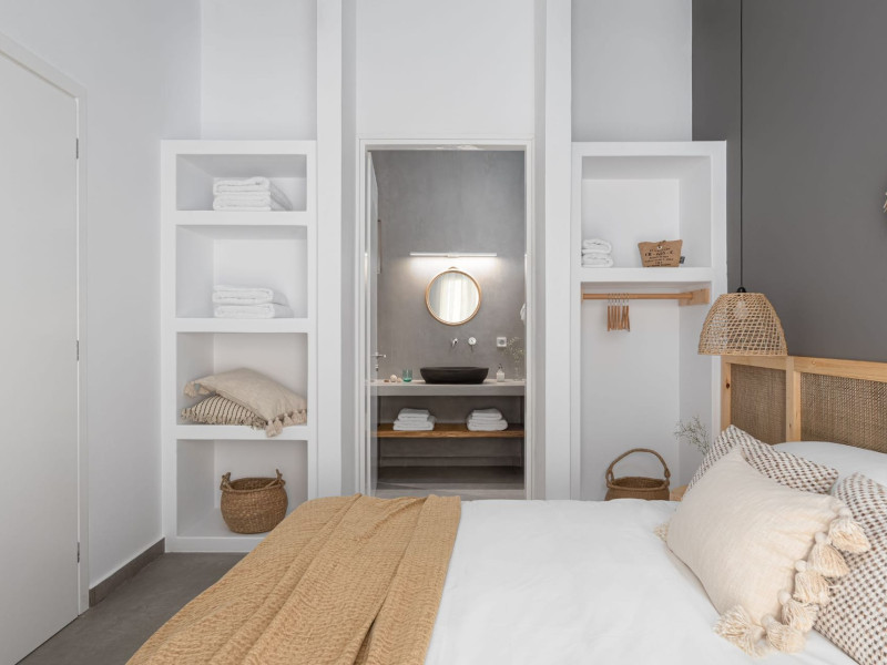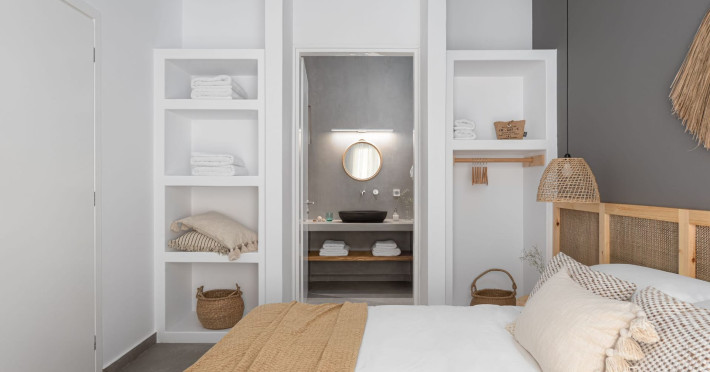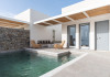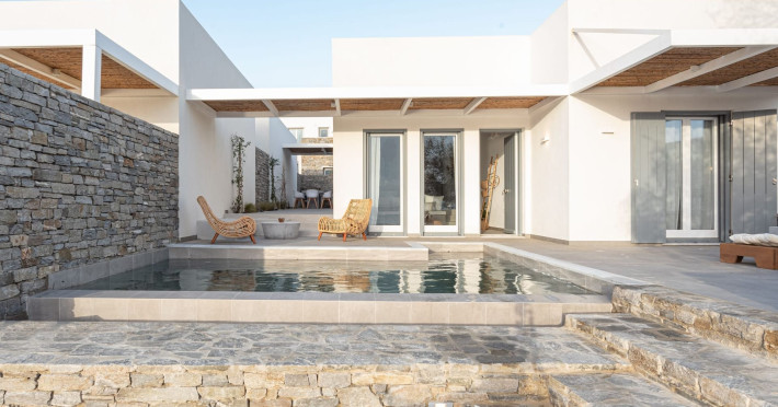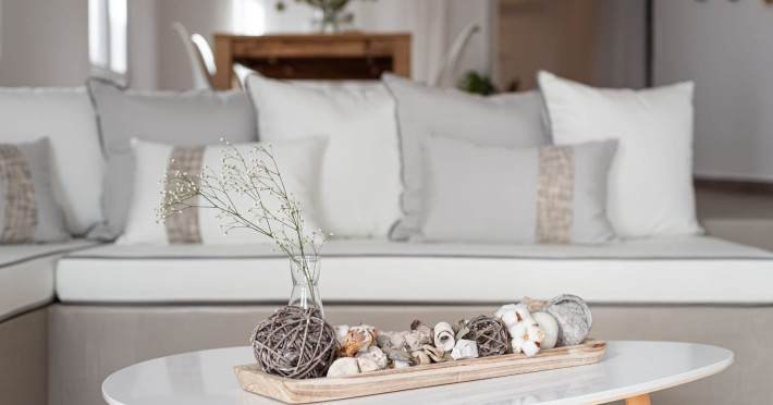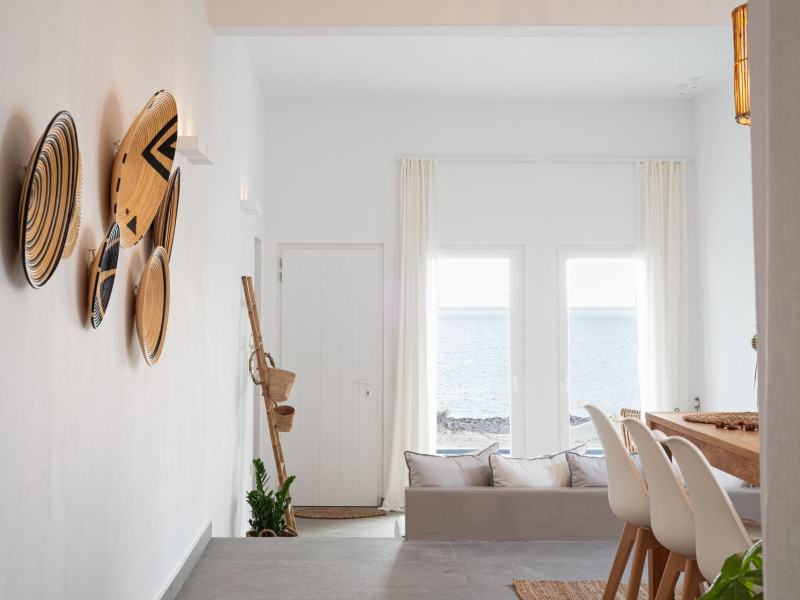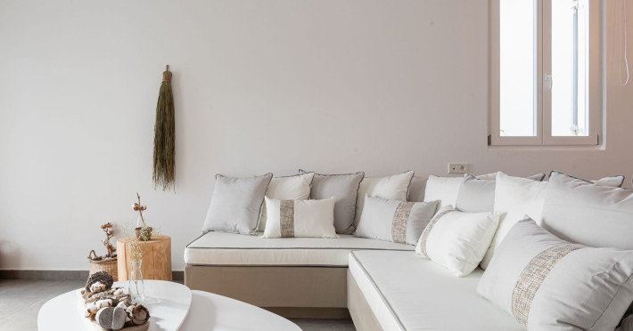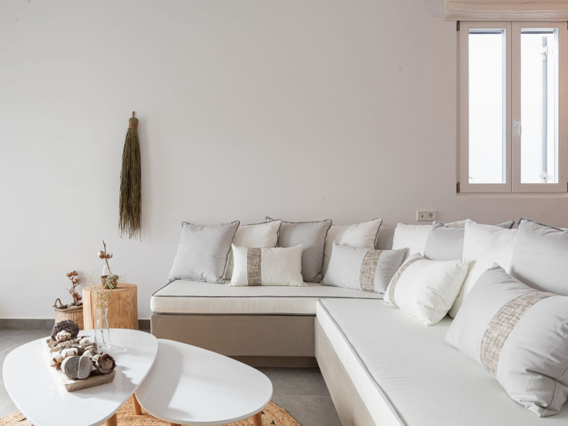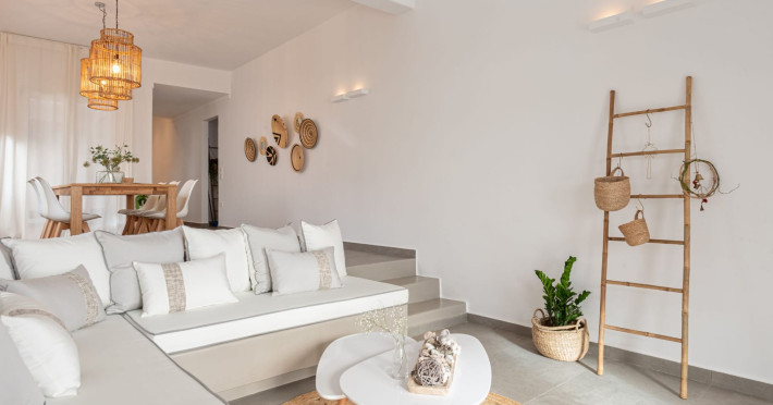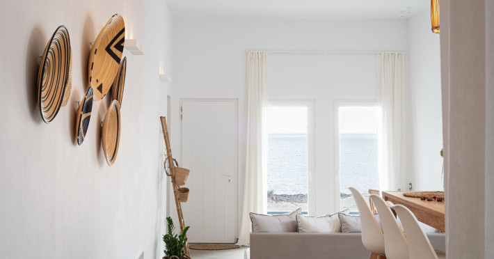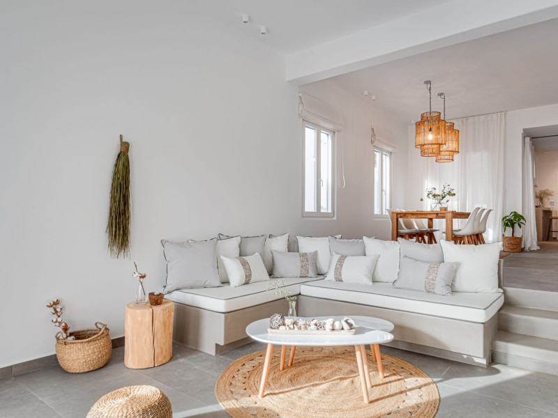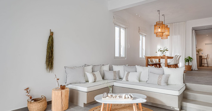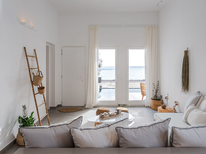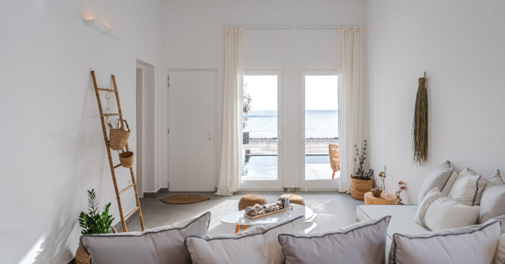 The interior is minimal in design and affluent in amenities, proposing to pamper you and help you leave everything behind. Neutral hues, well-crafted built-in furniture, Cycladic architectural details, and smooth lines create a paragon of homely luxury. The 130 sqm villa comfortably accommodates 6 guests and offers three spacious and airy bedrooms; one master bedroom with ensuite, plus one twin and one queen sharing a bathroom. All bedrooms have Smart TVs in case you’d like to enjoy a movie in bed. When in the living room guests can gaze at the sea views during the day and in the evening step outside to watch the magical sunset colors.