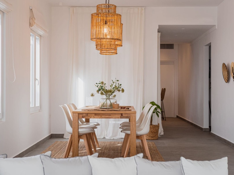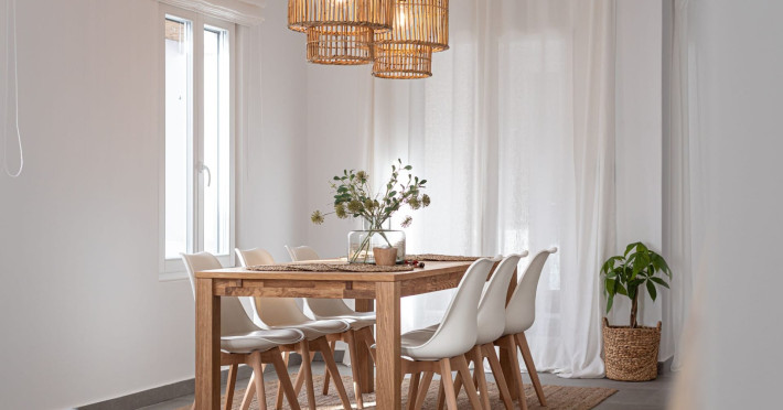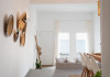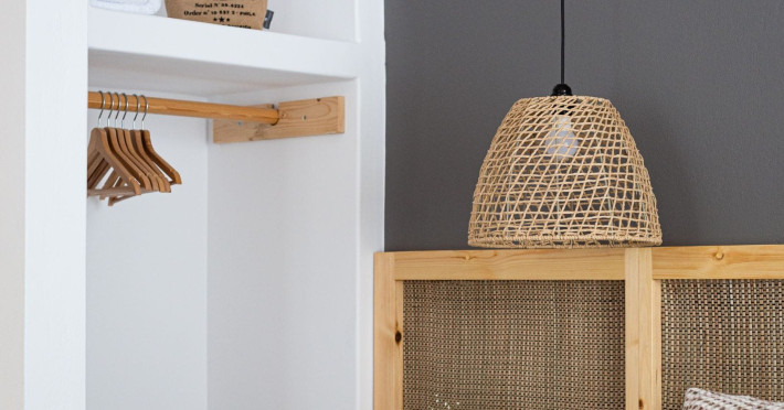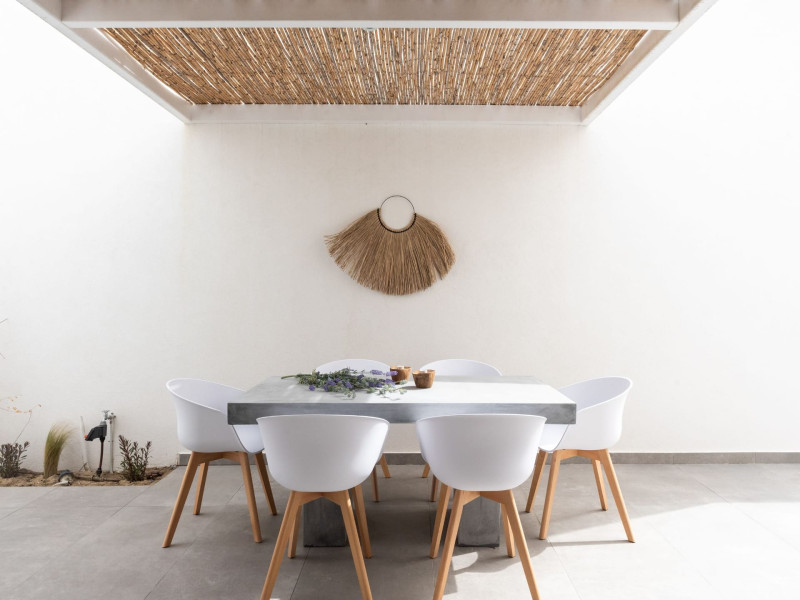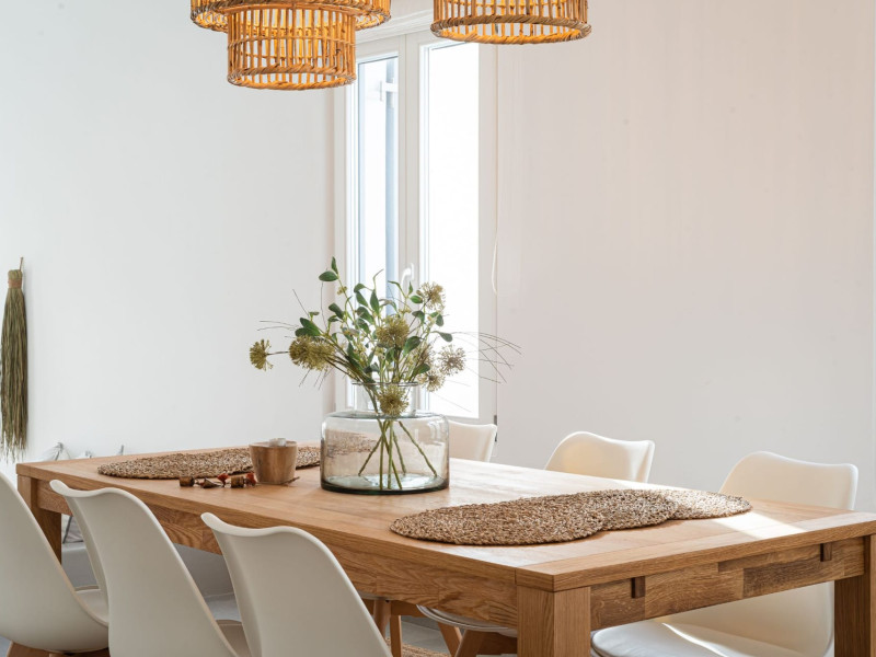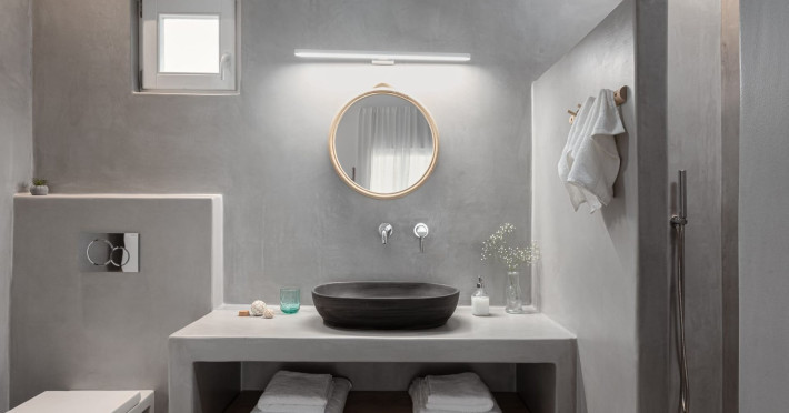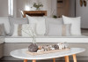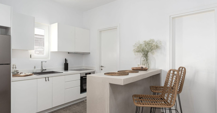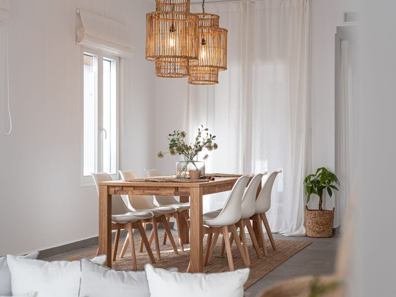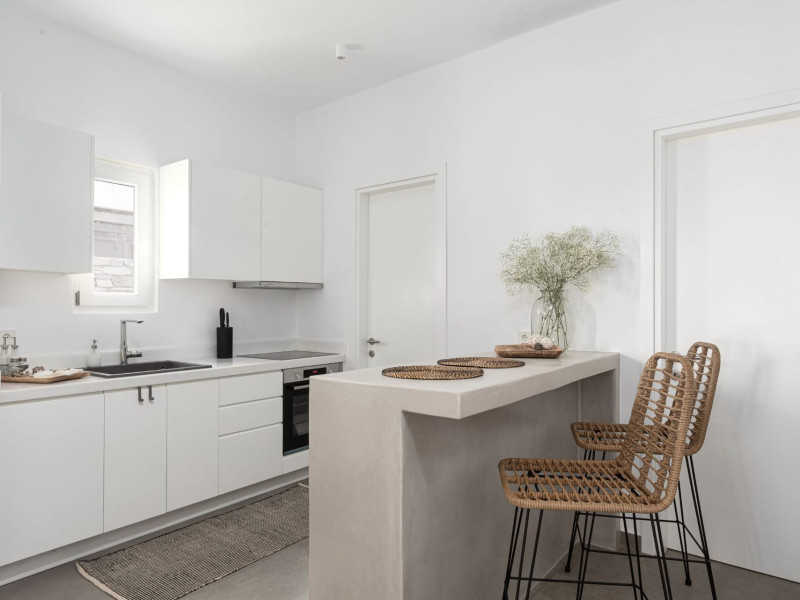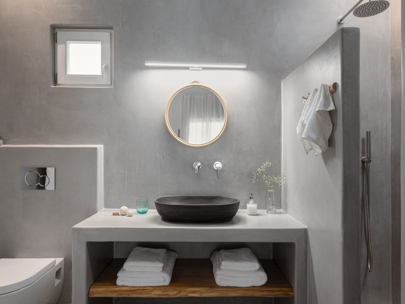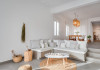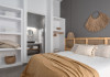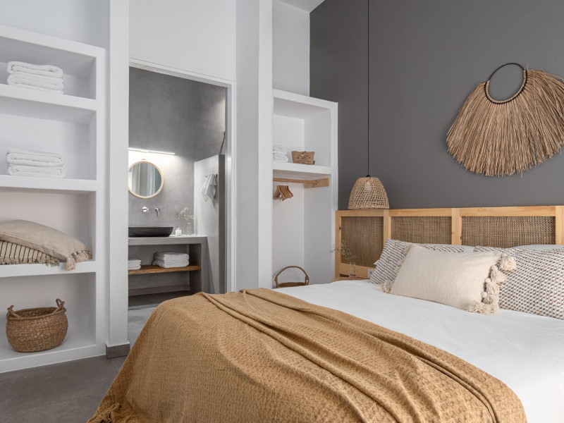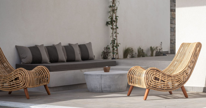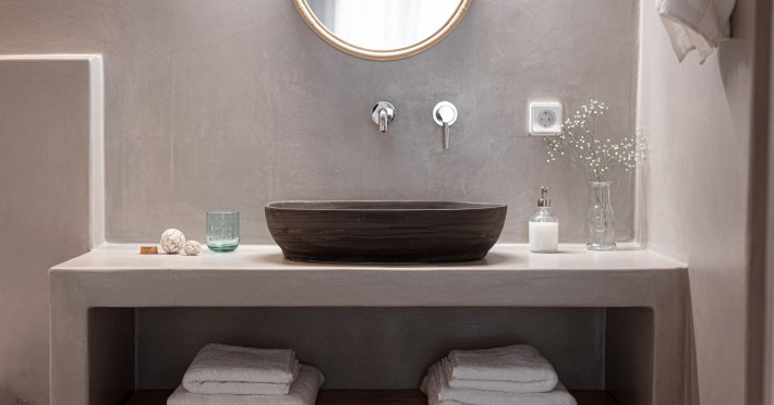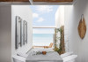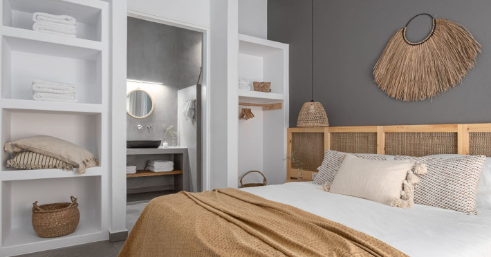 The interior is minimal in design and affluent in amenities, proposing to pamper you and help you leave everything behind. Neutral hues, well-crafted built-in furniture, Cycladic architectural details, and smooth lines create a paragon of homely luxury. The 130 sqm villa comfortably accommodates 6 guests and offers three spacious and airy bedrooms; one master bedroom with ensuite, plus one twin and one queen sharing a bathroom. All bedrooms have Smart TVs in case you’d like to enjoy a movie in bed. When in the living room guests can gaze at the sea views during the day and in the evening step outside to watch the magical sunset colors.