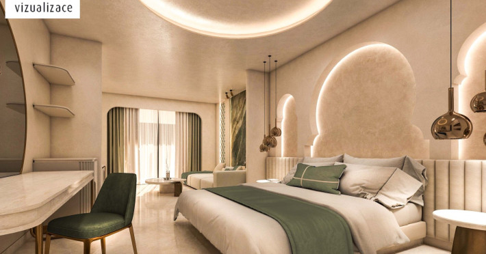 Suite, Deluxe, Beach Front: vedere la mare si piscina, mai spatioasa, dormitor si living separate de un perete cu un pasaj fara usa, aprox. 62 m²