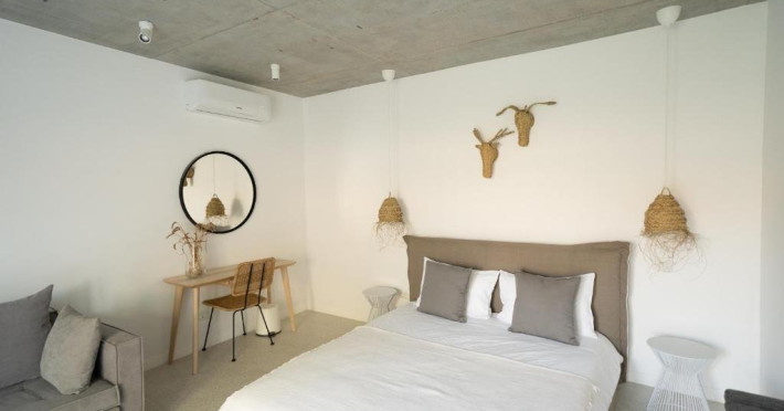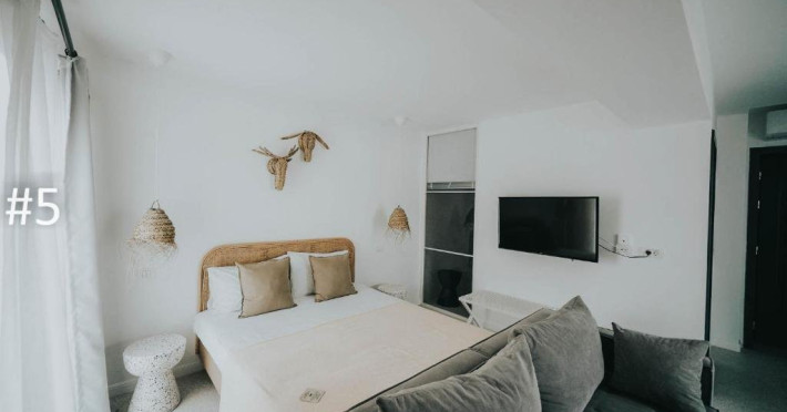 Dotari si serviciiThe Pines Boutique Villa ofera 8 spatii de cazare generoase si o piscina exterioara cu umbrele si sezlonguri, la care turistii au acces gratuit: 2 apartamente si 6 camere duble. Dintre acestea, 4 camere sunt la etaj, cu vedere fie spre campuri, fie spre mare, iar 3 au terase suspendate. La parter, apartamentele si camerele duble beneficiaza de curti private. Minibar in camere - contra cost. Parcare publica gratuita. Animalele de companie nu sunt acceptate. Servicii masa Vila dispune de un living-lounge pentru mic dejun.
