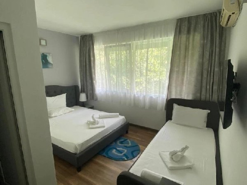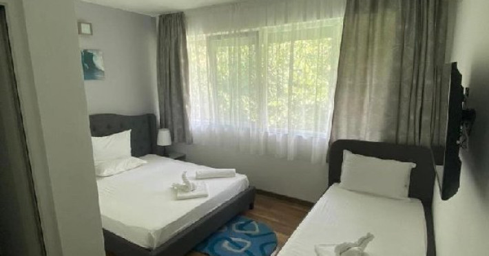 Dotari camere Camerele duble sunt dotate cu pat matrimonial (160-180x200), aer conditionat, tv, wi fi, minibar si baie proprie cu cabina de dus. Suprafata 12 mp. Camerele triple sunt dotate cu pat matrimonial (140x200) si un pat single (90x200). Sunt echipate cu tv, minibar, aer conditionat, wi fi si baie proprie cu cabina de dus. Suprafata 14 mp. Unele camere duble si triple pot avea balcon. Repartizarea camerelor se face la receptie, la momentul cazarii, in functie de disponibilitate. Apartamentele sunt compuse din doua dormitoare matrimoniale (unul cu pat de 160x200, celalalt cu pat de 140x200 si o canapea extensibila), baie cu cabina de dus si balcon. Ambele camere au aer conditionat, tv, wi fi si usa. Suprafata 30 mp.